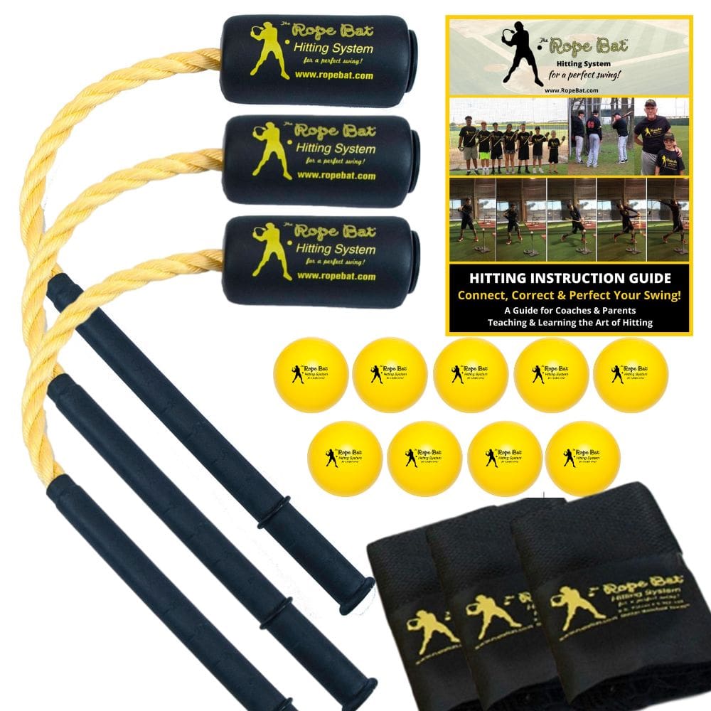 The Rope Bat® Triple includes three Rope Bats®, 9 soft training balls, a downloadable hitting guide complete with photos and videos, and three sport tote bags.
